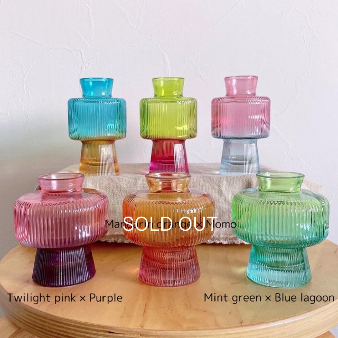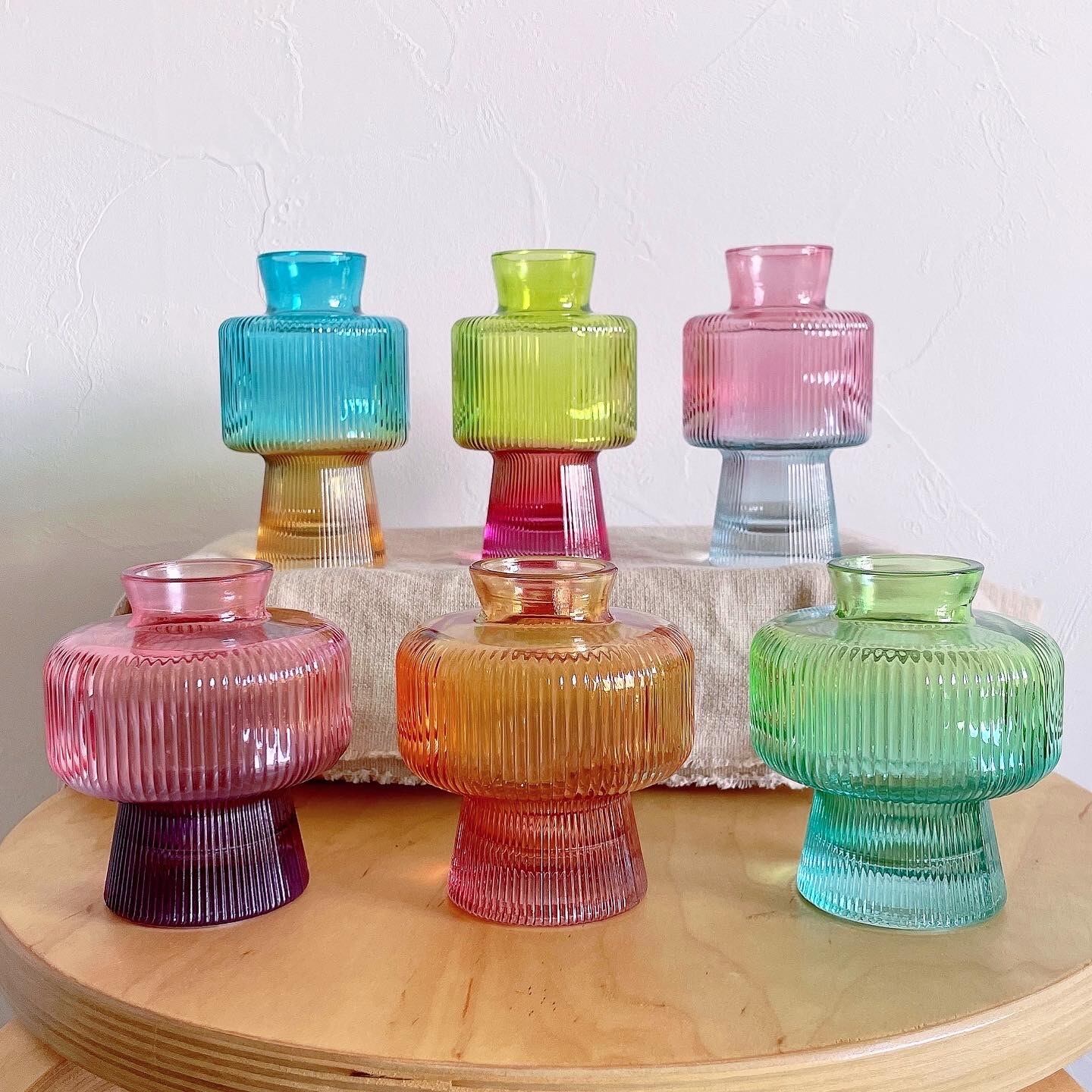 カラフルな彩りの中に花を美しく映し出す、ガラス製のフラワーベースです。