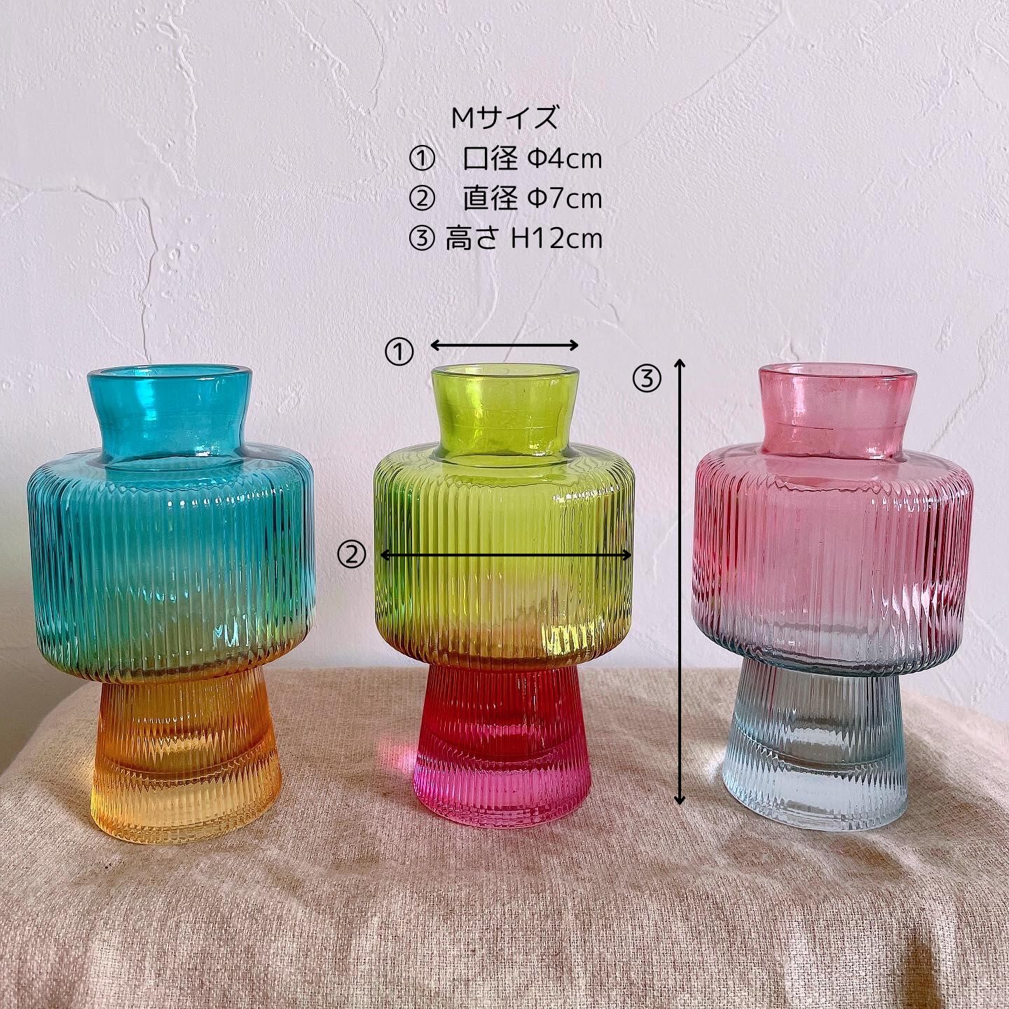 カラフルな彩りの中に花を美しく映し出す、ガラス製のフラワーベースです。